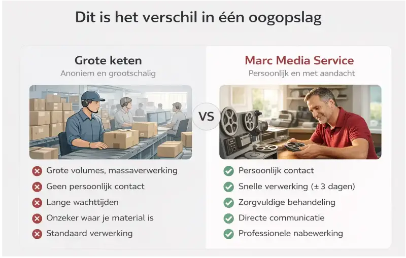 ✔ Persoonlijke service, geen massa verwerking: direct contact met de persoon die jouw films digitaliseert